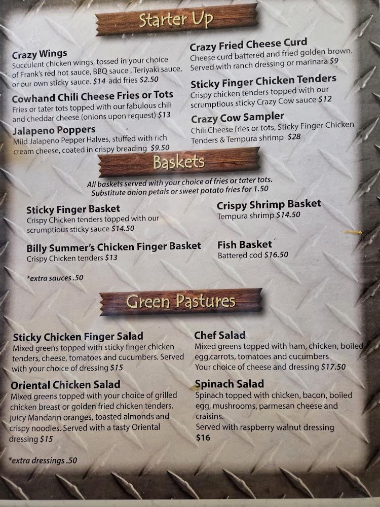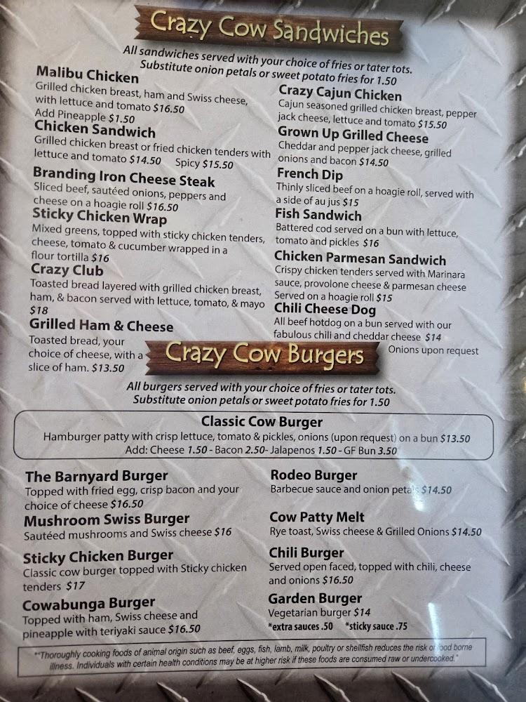 Crazy Cow Cafe offers a diverse menu appealing to all tastes. Breakfast lovers can indulge in hearty options like Ham Steak Breakfast and Breakfast Burritos. For lunch and dinner, the cafe serves burgers, sandwiches, and salads that keep guests coming back for more. Expect to find unique drinks like their signature Moolicious Specialty Beverages, ensuring tasty refreshment with each meal.